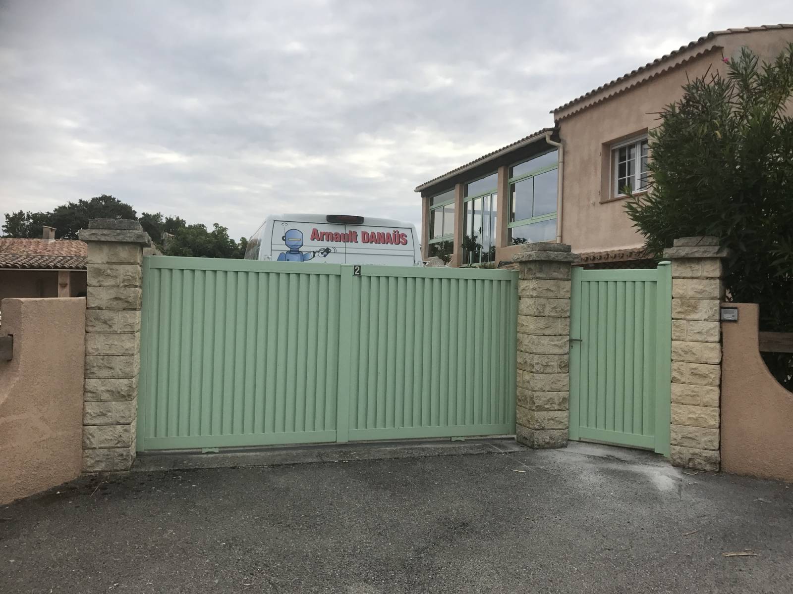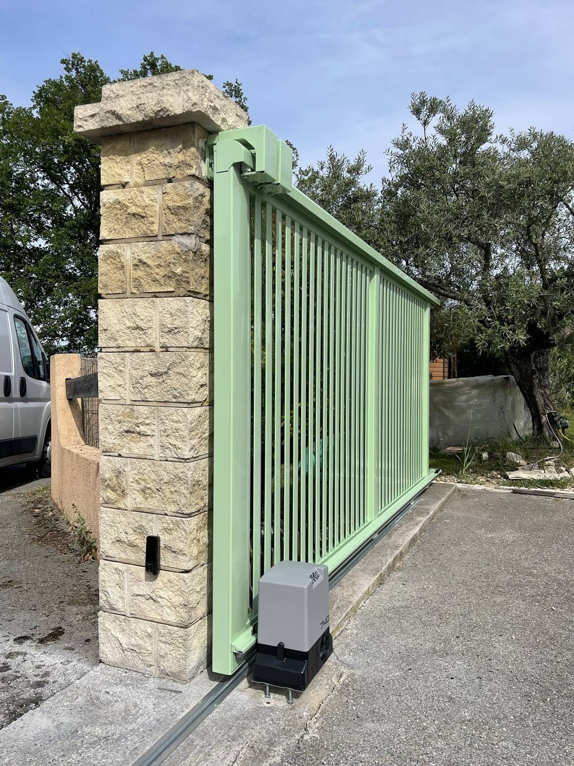 Remplacement d'un ancien portail par un portail en aluminium coulissant couleur vert RAL 6019.