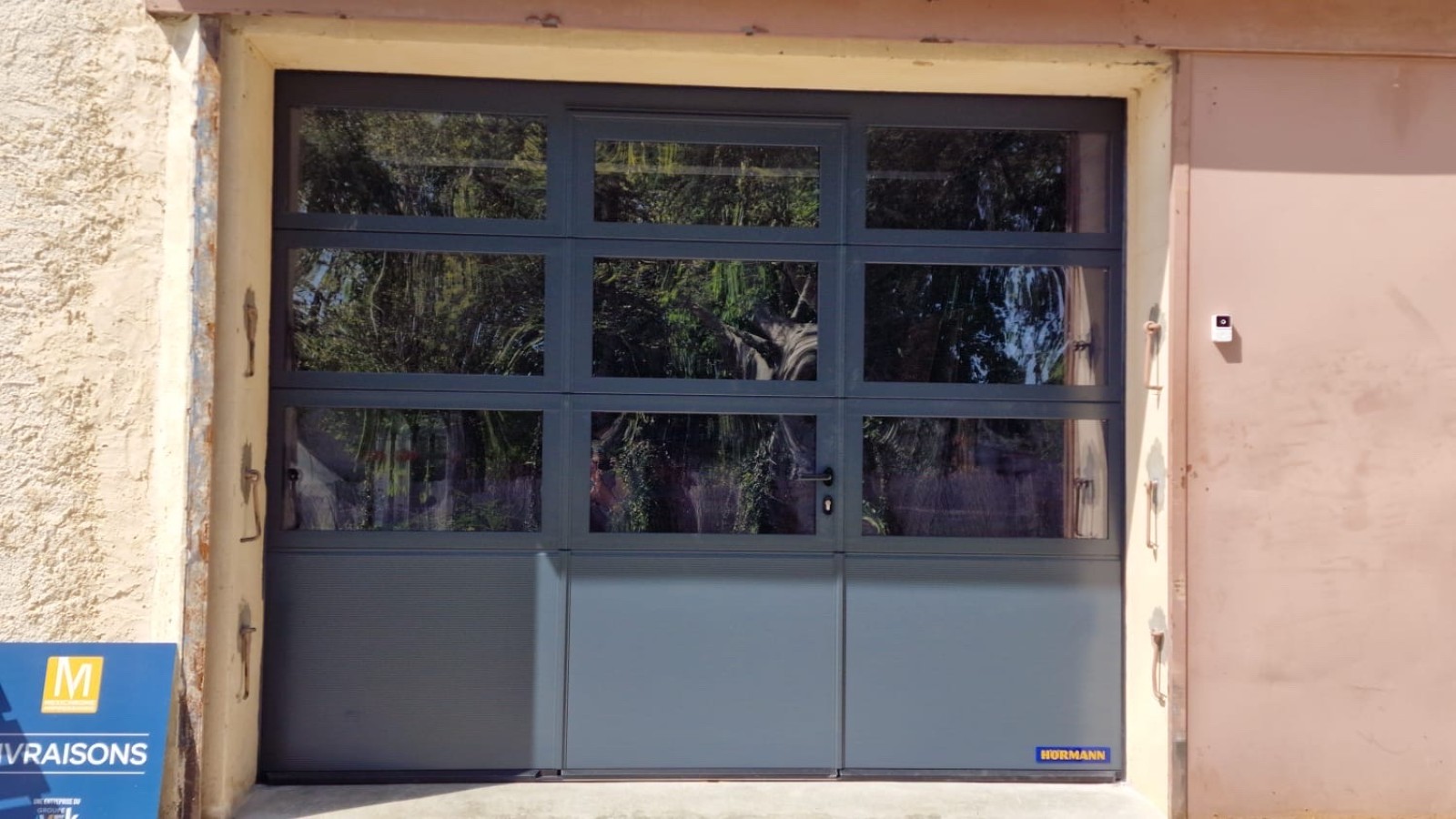 Installation d'une porte sectionnelle industrielle vitrée avec son portillon par Arnault Danaus société se situant sur Peyruis